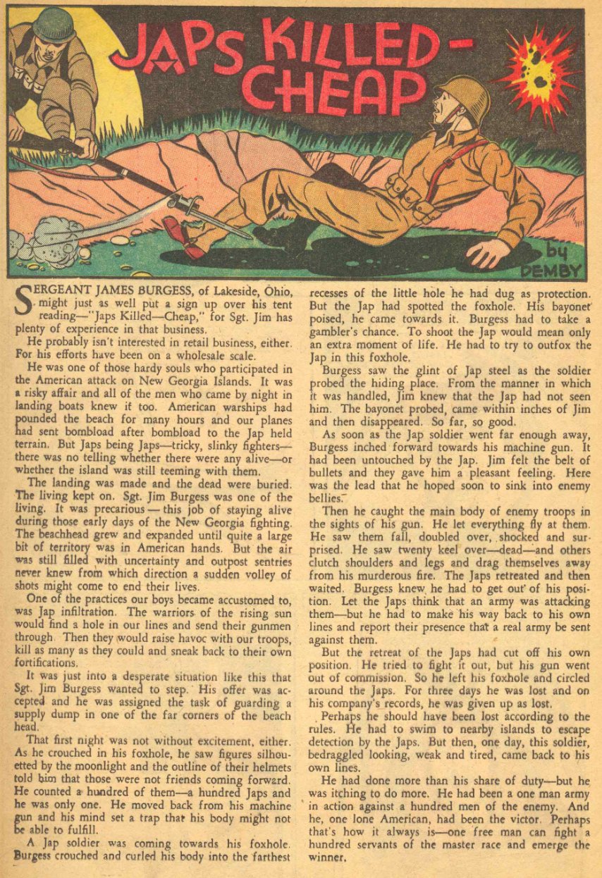 The title alone gives the reader a good idea of the low attitude there was as far as the Japanese went. 'Japs Killed, Cheap' is pretty blatant. One of the most famous quotes from the war, an actual quote, is 'Kill Japs, Kill Japs, Kill More Japs.'