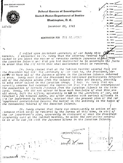 "Dr. Bundy stated that at the Cabinet meeting several days ago the President had told the Secretary of War that he, the President, desired to have all the Japanese aliens in the Hawaiian Islands interned at once."