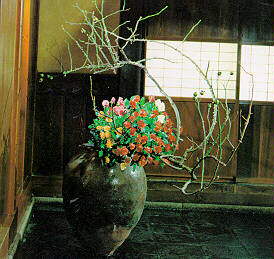 The fundamental composition of Ikebana is shown in the three main lines which make up a triangular figure in this particular flower arrangement.