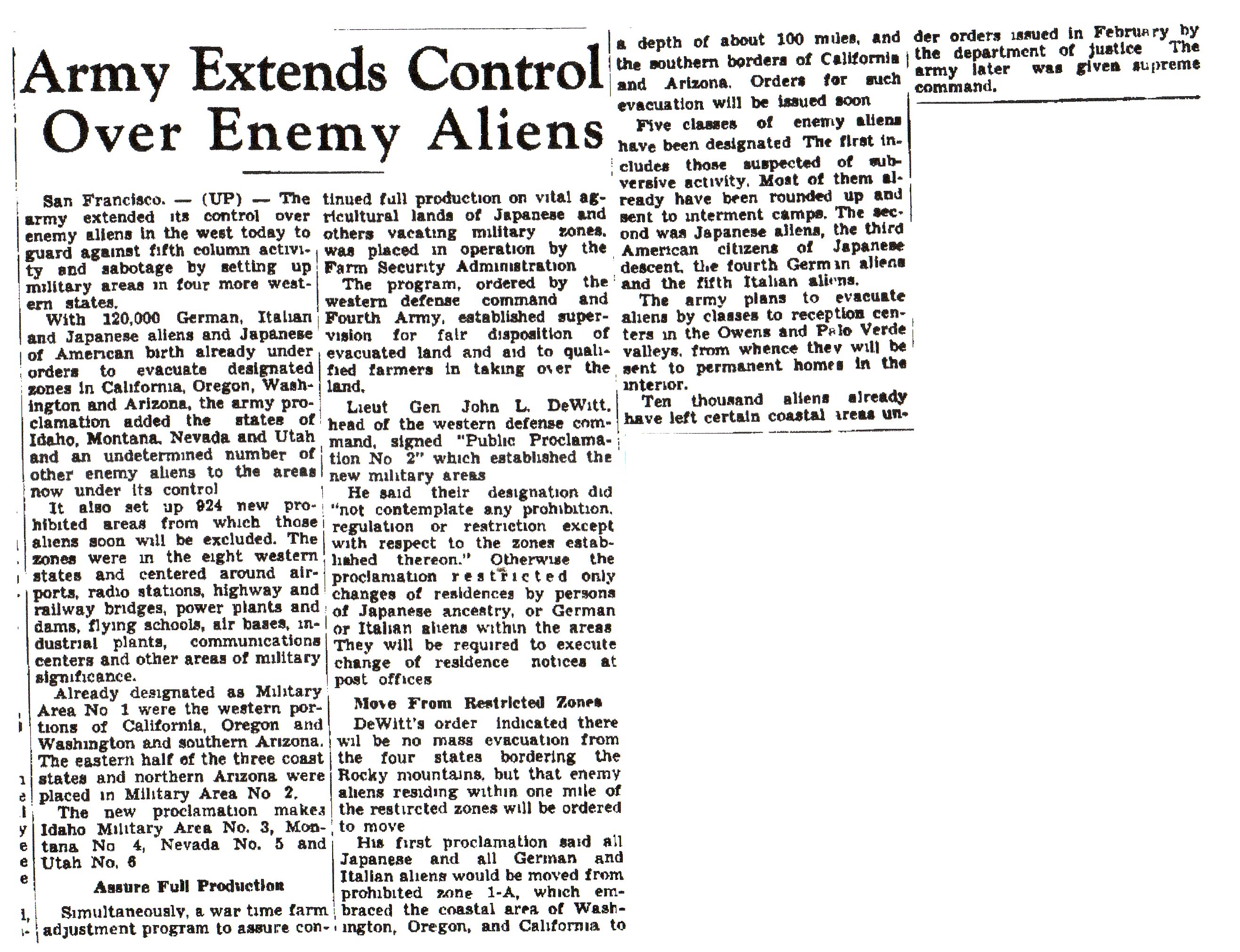There was definitely a lot of coverage in the press about the initial controls and plans for evacuation for persons of Japanese ancestry. The last time anything like that was done was when the U.S. government put Native Americans on reservations.