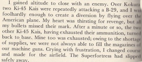 The book talks a lot about the training of the kamikaze and includes information on the problems they were having in getting fuel for their planes (sometimes they had to do nothing because they had no fuel for their planes at all), and in getting decent planes (they sometimes used bi-planes for training.) He also talks about the times he fought against the B-29's, and how big a problem those planes were for the Japanese.
