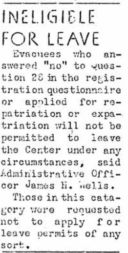 Page 1: Inventory to be taken; departers may receive emergency assistance; plans revised for center auditorium-gymnasium; property office will be opened; vacant lots to be made into recreational areas; agricultural work offered; Japanese books returned.