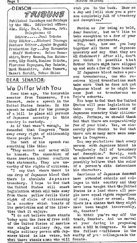 Page 1: Evacuees may leave center without jobs; plans for carnival; mission to close; officer killed in accident; beet workers are needed; Camp Shelby men ask for Denson girls; arbors must be removed (fire regulations); Taylor to go to Washington; co-op workers adopt new hours.