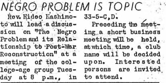 The 'Negro problem?' I'd love to know just what was said at the meeting. It was held by a reverend so I image it was anti-prejudice, but it's still be interesting to know just what was said.