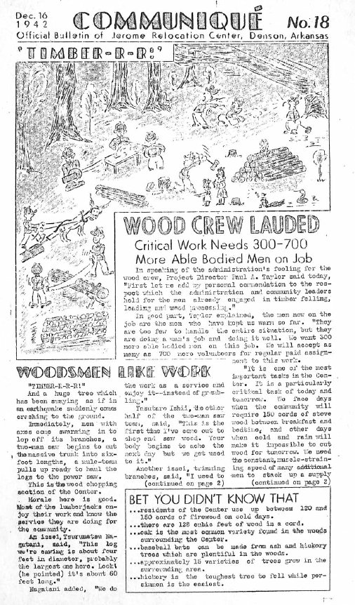 Page 1: Council to govern here; gypsum walls to be installed; 500 to 750 men will be needed for wood cutting; the center will make its own soap; 18 years old need to sign up for Selective Service; the center has gotten a bunch of calls for domestic help positions; soft drinks are on sale, but the bottles will have a two cent deposit; mochi will be available on January 1st; the Nisei can now own cameras.