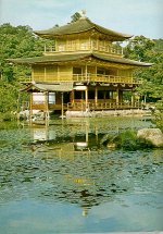 The Golden Pavilion, Rokuon-ji, Kyoto. The building was originally built by Ashikaga Yoshimitsu for his retirement. After he died it was turned into a Buddhist temple but most of the buildings associated with it were destroyed by fire or moved to other locations. In 1950 this building was burned down by a crazed Monk.