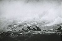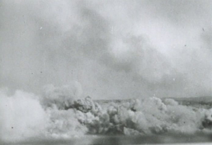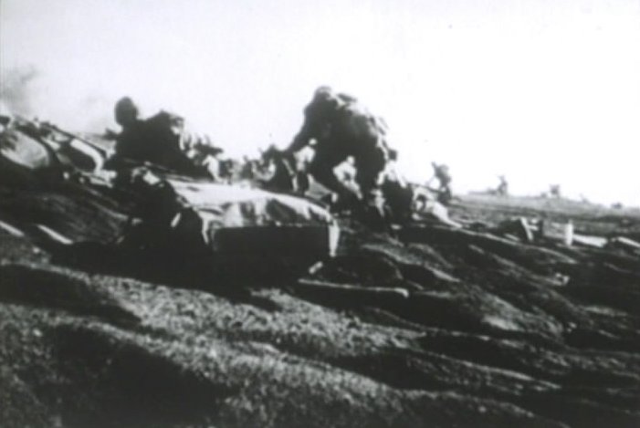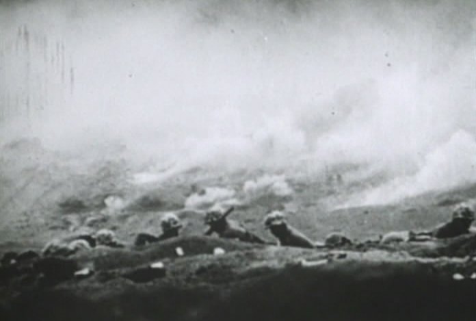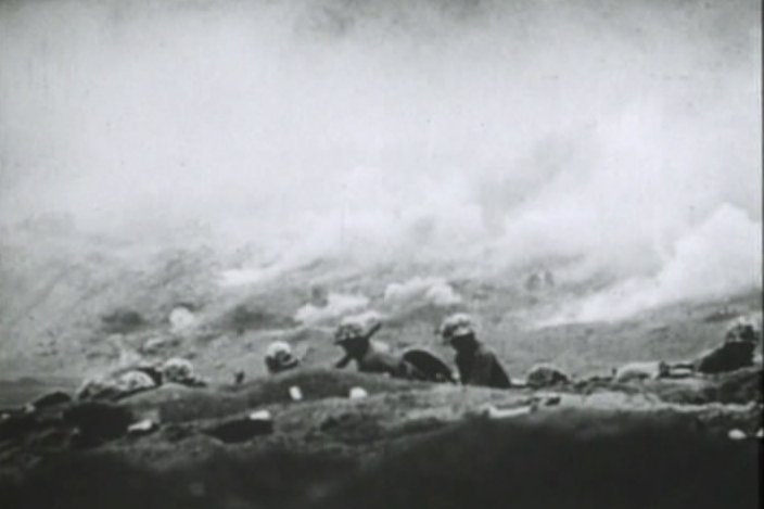 “Iwo Jima spells death for about 20,000 Japs. “ That's the opening narration; almost all of the rest has been nothing but combat sounds and the sights, and it's quite loud.