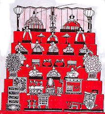 The top tier is for the Emperor and Empress. A miniature gilded folding screen is placed behind them as it was in the real court. The second tear has three ladies-in-waiting. The third has five male court musicians; the fourth has ministers sitting on either side of trays of food; the fifth has guards with an orange tree on the left and a cherry tree on the right.