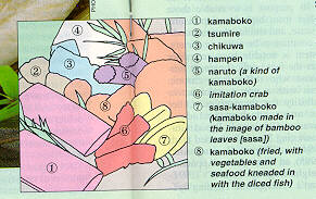 Other kinds of nerimono include: chikuwa, which is skewered ground fish on a bamboo pole, roasted over an open file, and then the hollow bamboo tube is stuffed with cheese or some other filler. Hampen is a soft nermino often used in oden and other hot, stewed dishes. It consists of ground fish and grated yams. Tsumire is a fish ball made by kneading pulverized fish, eggs, flour, soup stock and other items. Its use, though, is limited to soups and stews.