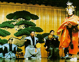 The stage will also probably have a painting of a pine tree on a backdrop. The pine is a symbol of strength and the eternal. Long ago, according to legend, a priest was seen dancing under a pine tree, seeking to have divine inspiration added to his dance. The painting of the tree thus symbolizes a request for the same sort of inspiration for the play.