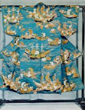 Then, still in the "highest-quality" time period for costumes there is the one below, made during the early part of the Edo period. It is classified as a Nuihaku or embroidered costume. The ships are Dutch sailing ships; the waves are in gold leaf and the ships and flowers are embroidered.