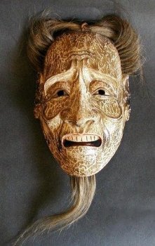 These is a picture of a Noh mask from the late Edo period. The mask is of a character named Ko-Jo, or old man. Ko-Jo was named after its creator Koushi. He appears in elegant scenes as a distinguished character.
