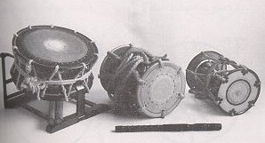 The music for the Noh is presented using the above instruments. Going from left to right there is the daiko, or stick-drum; the otxuzumi and the kotsuzumi, or hand drums, and the fue, or flute.