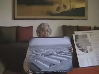 She holds up a photo of the camp. She adds that it was a self-governing town.