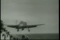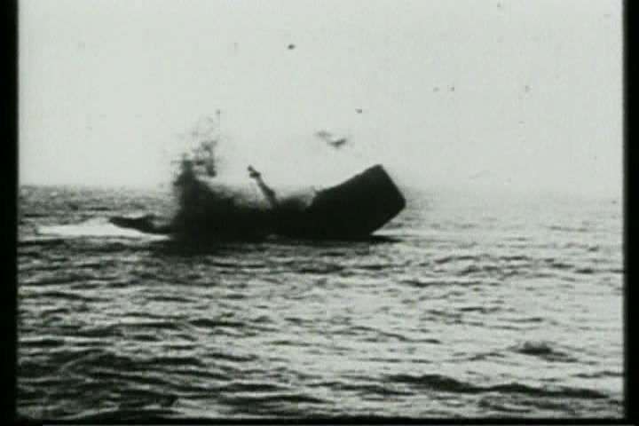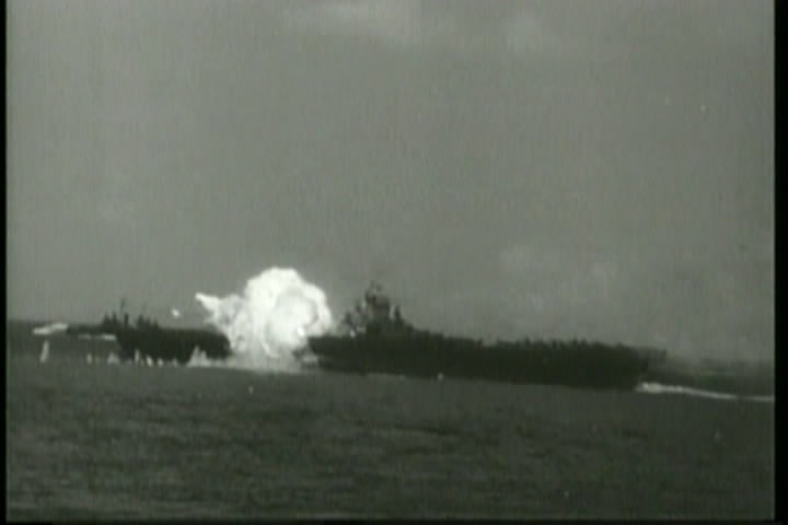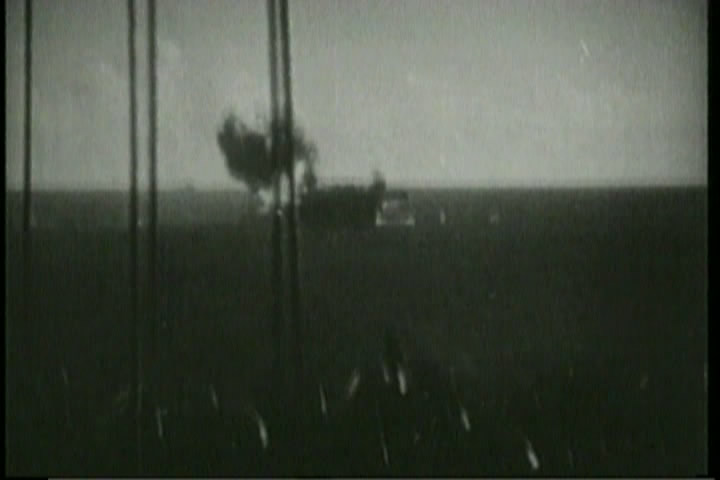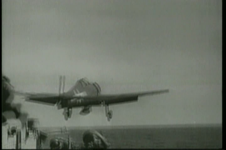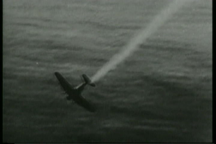 Japanese bombers on a suicide mission. Only half reach the target area, probably due to lack of fuel. One hits an aircraft carrier but the plane has so little fuel on board it doesn't even explode.