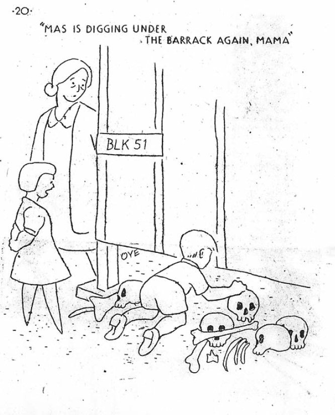 The cartoon makes sense if you remember that a skeleton actually was found under a barracks building, probably a skeleton of a Native American.