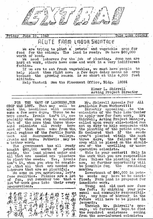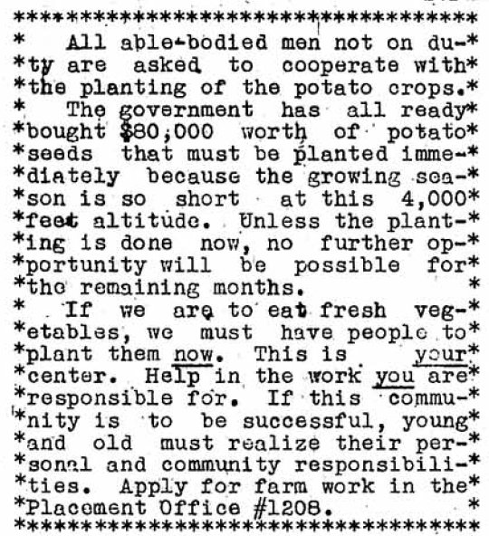 There was a desperate need for farm workers. The people in the various camps make a major contribution to the war effort in their work on harvesting crops, ranging from cotton, beans, sugar beets, and onward. In many cases they were able to make more money then they would have in the camp.