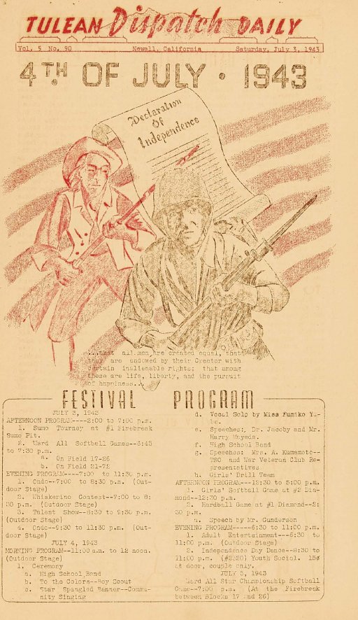 Page 1: Music concert tonight; more Nisei may aid war effort with expansion of Camp Savage; pay, timkeeping rules changed; last day for scrip use; Graves visitor on project; cold spell damages potato crop; paper stand open Thursday.