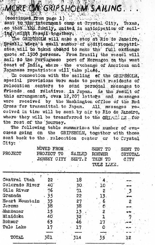 Page 1: Restrictions made on gatherings; workers must be assigned before reporting to jobs; last rites for Tule-bound; at placement; chicks here from Jerome; file leave by Oct. 7; employment officer; opening of school delayed due to lack of aid on construction.