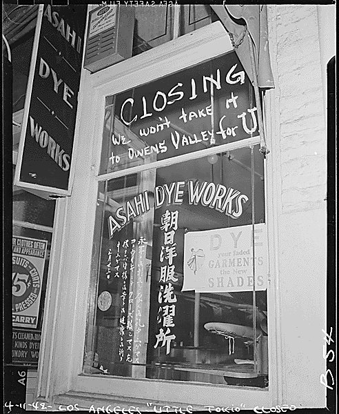 The Last call to pick up suits and gowns before shades were pulled down in "Little Tokyo" prior to evacuation of residents of Japanese ancestry. Many were assigned to Manzanar, War Relocation Authority center, in Owens Valley, California. |