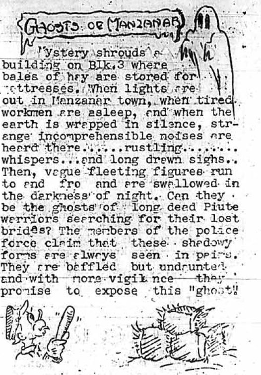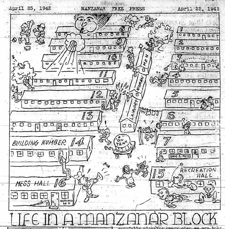 Page 2: There's an article about work orders needed for jobs. Rice and shoyu have arrived. There's a sort of odd cartoon about Manzanar's best-dressed man. The next issue of the paper will be a guidebook. Firemen got a truck.
