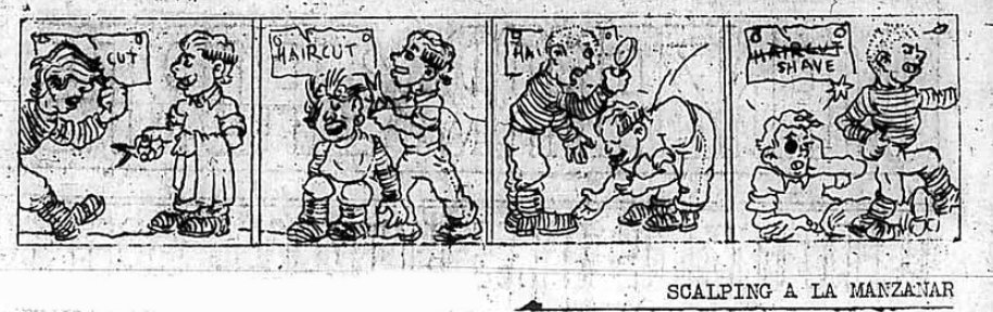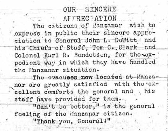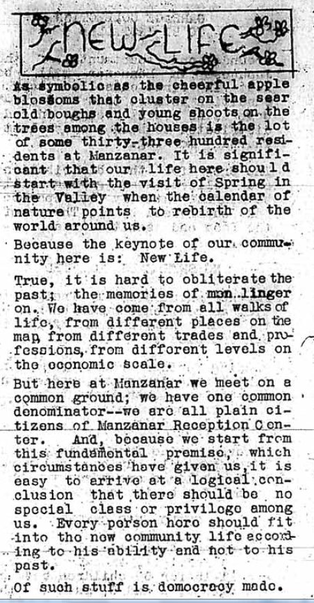 Page 1: Manzanar has held its first election, and there's been a marriage. Only business visitors are being admitted. The residents are being classified according to primary and secondary vocations. Rice and green vegetables will be arriving soon.