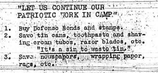Page 3: Shipping items into the camp is now okay. New arrivals are to be registered at 14-15, the article says. I assume that's years of age? There will be a meeting of mothers to help them learn how to properly feed their children. Inventory of all government-owned materials has been finished. Block leaders have named a Constitution Committee. An open house will be held. Mothers and young children are urged to sit at certain tables in the mess. Screens are planned for the apartments.