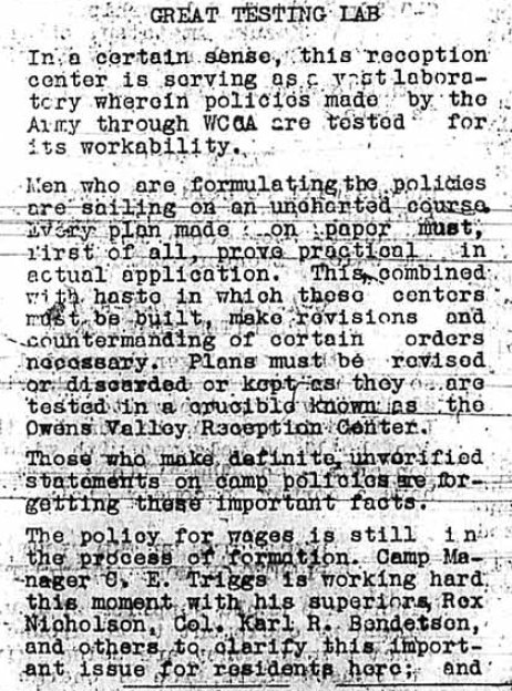 Page 3: All residents must register their occupation. No private enterprise will be allowed. The Los Angeles Daily News has commented on the Manzanar Free Press. There will be a meeting for girls who want to participate in recreational events. The paper needs a typewriter of a certain kind. There's an article wondering if there are any Japanese Christian Scientists in the camp. There's an article about a lizard that came up through the floor of one apartment (the floors had knotholes in the wood and often spaces between the pieces of lumber) and scared a woman in the room. A larger and more complete supply center is being constructed. Pre-school play plans are being set up. There's an article about not monopolizing ping-pong.