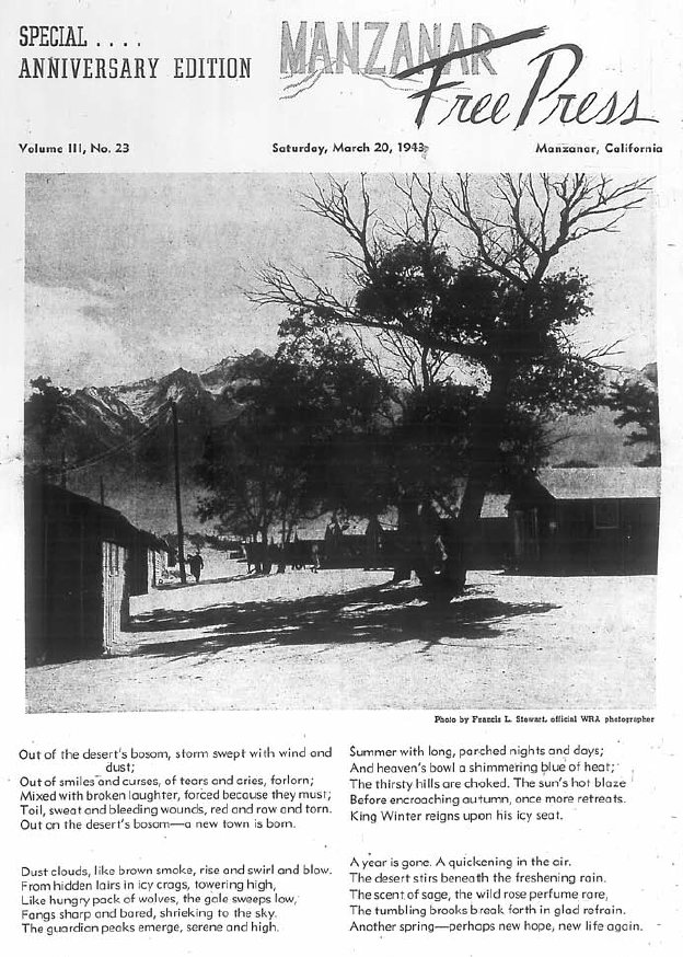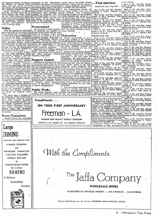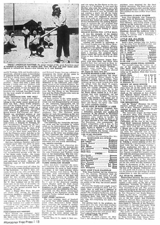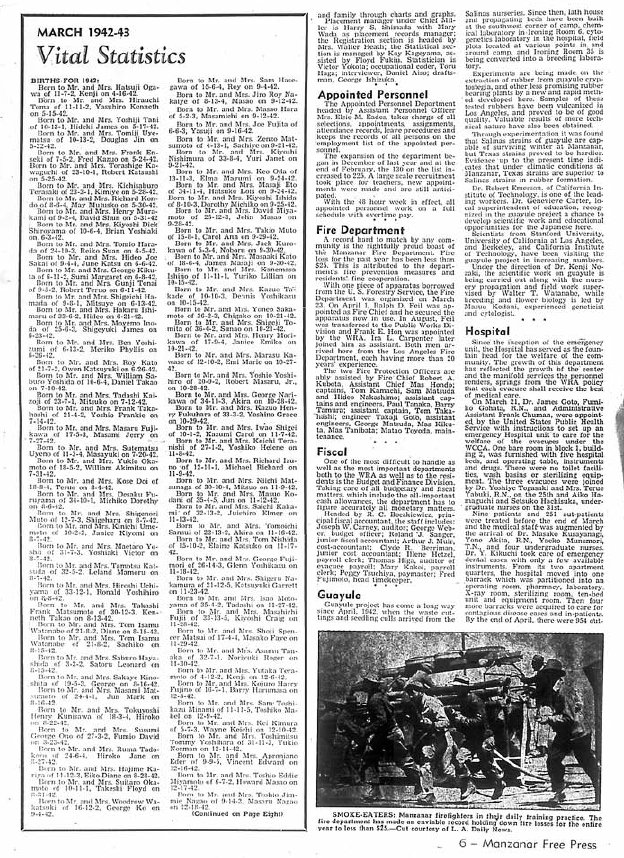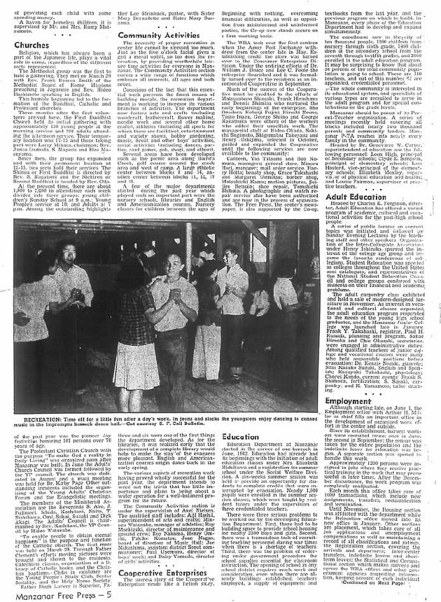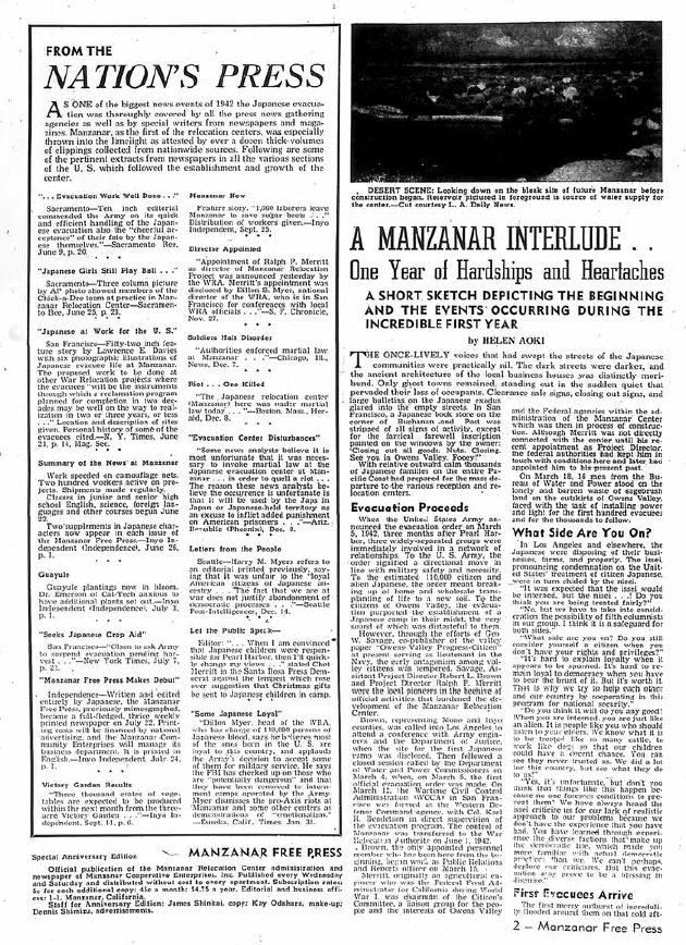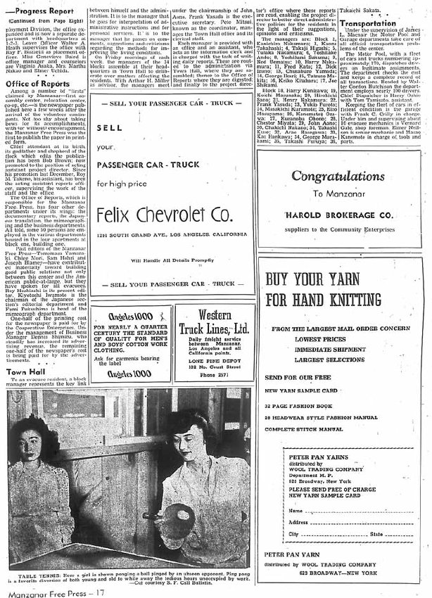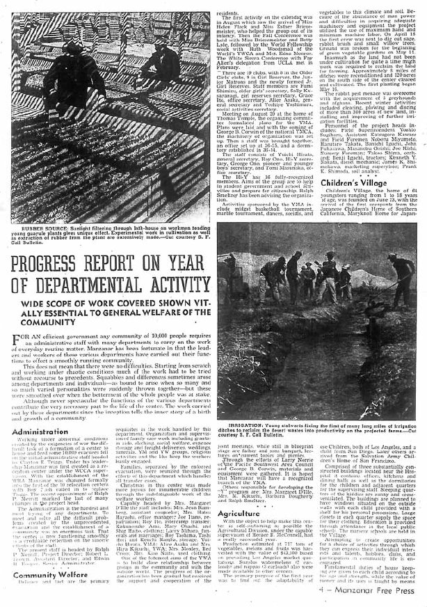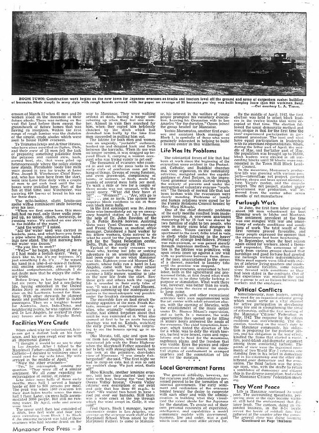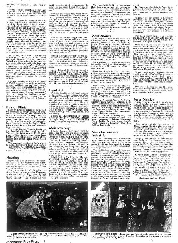 Page 1: Local education week observed; Merritt greets volunteers on anniversary; inventory will be made on residents' farm equipment; cooperative basis may be planned for activities; Nisei soldier on furlough; question 28 still open for change; for quick rebates turn in receipts; new canteen manager old-timer; exhibit works compare favorably with outside; 36 trucks headed for Camp Haan; low water pressure here prevents use of fire hydrants.