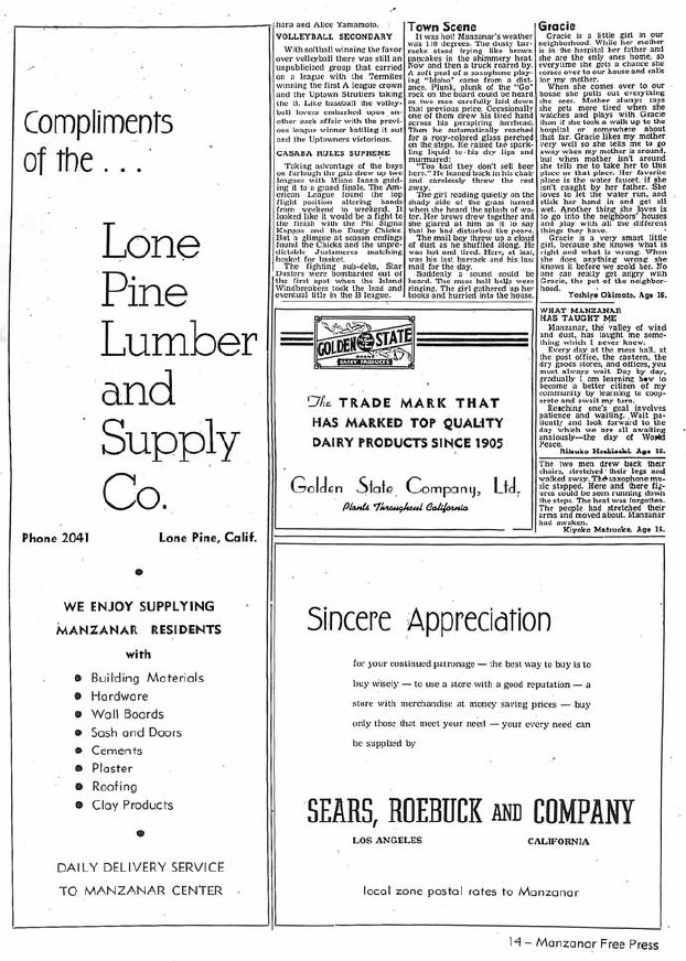 Page 3: Twin Pines Trail; 'most people are friendly' says letter on outside life; Around the Blocks; Unihi Hi-Y project to aid Manzinites; job offers vary; Forget-me-Nots in installation; Going Out?; YMCA men due from Los Angeles; library fines make small fortune.