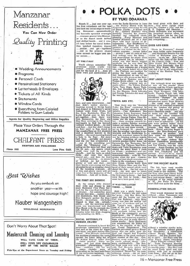 Page 1: Schools to observe nation-wide education week; sports; no plans set for building of sanitarium; assortment of jobs reported; more information on disposal of property; straw for ticks finally received by housing dept.; three groups leave for beet fields; Beards and GI's for pioneer jig; irrigation plans now under way; honest finder; pay checks here; WAAC attire and life.