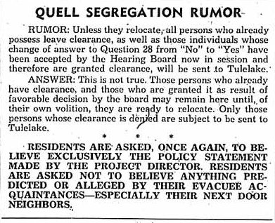 Page 1: Clothing allowance; slippery street causes collision of automobiles; two co-op delegates attend conference; commence hearings on leave clearance; living quarters to be 'frozen'; appreciation letter sent to president; chief steward tells shortage of milk supply; award sportsman trophy; Yamashita explains shortage of paper; Fisher speaks at church services; Manzanar ships melons to Tule Lake; seek workers for Montana contracts; food cost decline seen in report; award diplomas to English pupils.