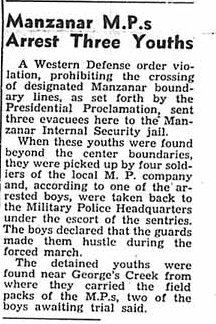 Page 3: Yonai wins beauty laurels; helper needed; Manzanar High plans open house; Honwangi Temple seeks claimants; outdoor movie receipts revealed; arrest man for making sake; four auditors arrive here; two residents under arrest (building a cellar).