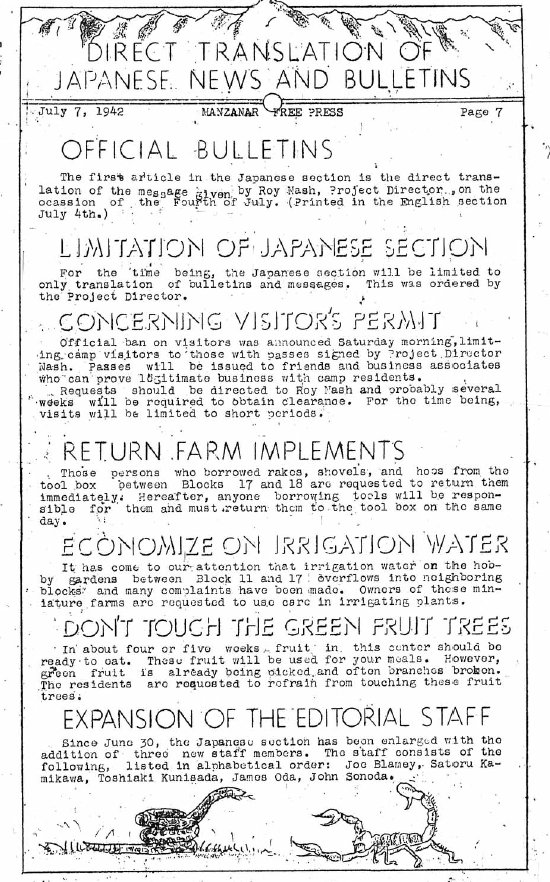 Page 1: Manzanar celebrates fourth; Campbell returns from S.F. trip; message from project director; meal hours changed; new studio opened.