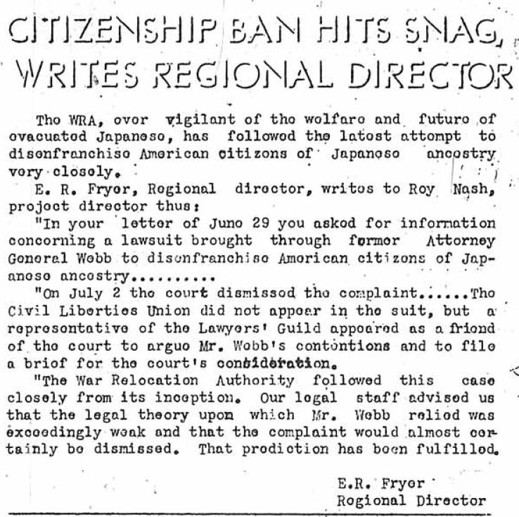 Page 1: Immediate action urged for repatriation; payment of $15,000 in June wages; fifteen block leaders open offices; men's clothing distributed to first arrivals; Friend's service committee confer to speed work on student relocation; gas tank explosion hurts M.P.