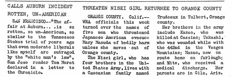 Page 2: Mary Kitano receives writing commission; discrimination, facisim 'human degreation' says CIO secretary-treasurer; Buddhist directory still available; ILWU cont; ex-Tulean kills self in New York; Manhattan reader hints to race discriminators.