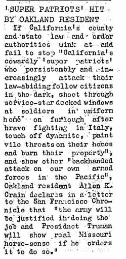 Page 1: More appointed staff members resign as center closure nears; reports favorable on eastern coast for ex-fishermen; Seattle hostels now available; Nakata receives Bronze Star award in Italy; creditors asked to file claims at once; two blocks hold combined picnic; Protestant church holds youth rally; Protestant church slates 'kids' party; Tuleans depart for internment camp; eleven ask repeal of Army status; Bing Crosby visits Lone Pine; Wilson warns aliens of land purchases; Akita heads salvage department.