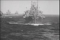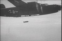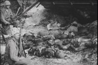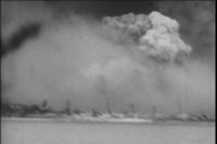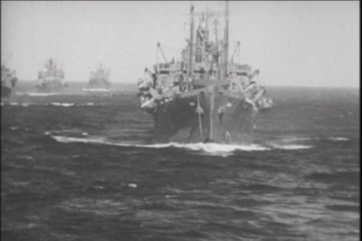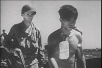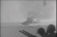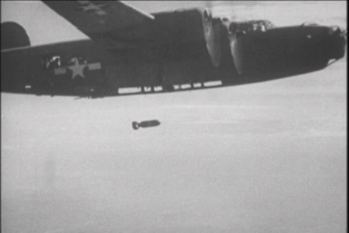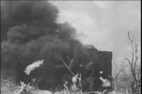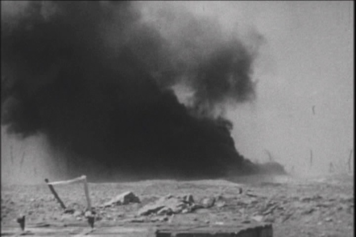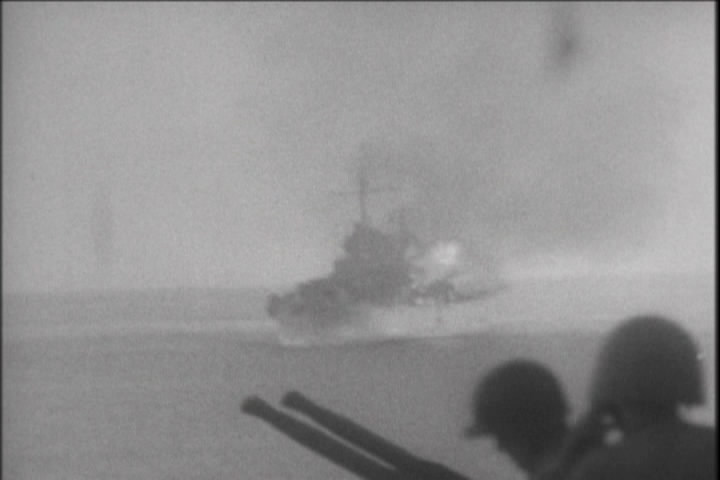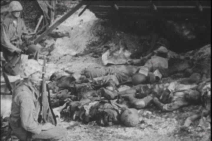 A Japanese pillbox is blown up. Earlier the film showed a Japanese sniper dead in a tree and the commentator talked about his meeting his “honorable ancestors.”