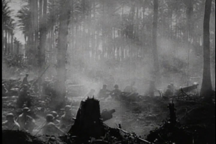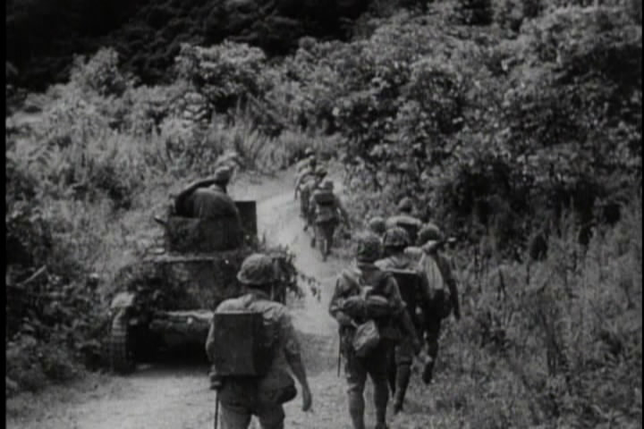 The video tells how tens of thousands of Japanese troops are bypassed and cut off from aid, and how the allies advance over a thousand miles closer to Tokyo in a period of about a year.