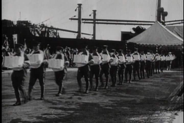 One of the rare scenes I've found of Japanese dead being returned home in white boxes containing their cremated remains.