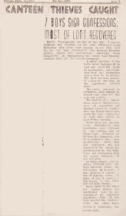 Page 3: 300 more have left for farm work; invalids will be moved to new housing; a rattlesnake has been killed; 400 attended a funeral; a co-op will handle telegrams, and the canteen was robbed.