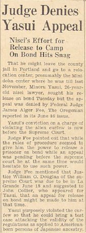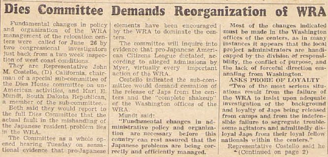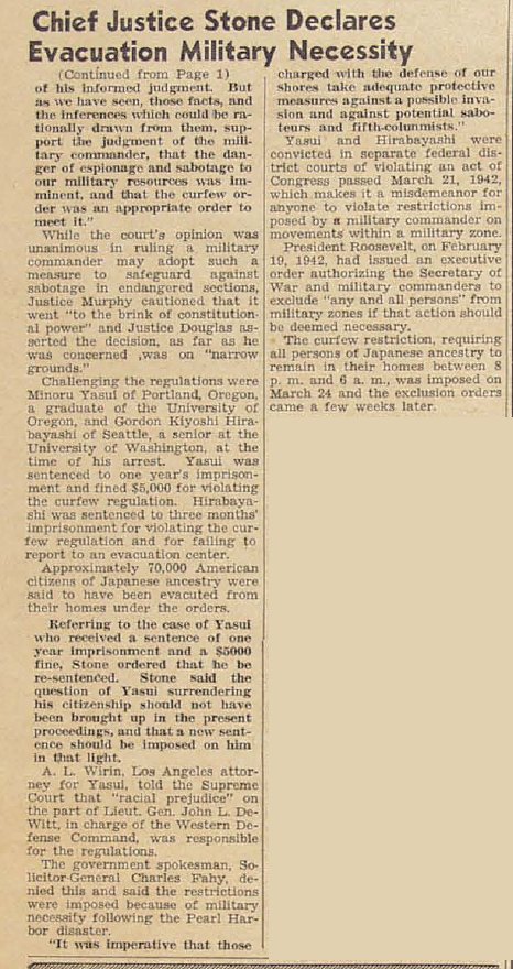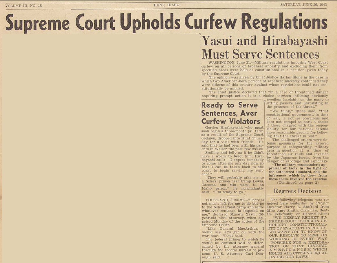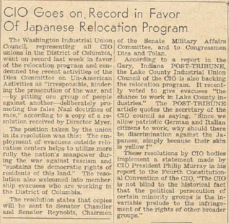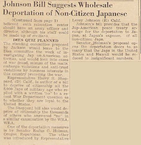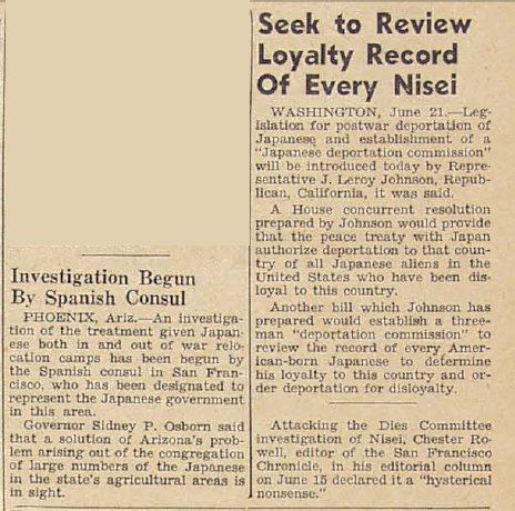 Page 1: Procedure simplified for employment of aliens in government-contracted jobs; residents will vote on charter; diet of evacuees depends on centers' farm output; 16 students to receive Seattle High diplomas; Japanese section printing approved; unemployment benefits policy changed; Stafford returns from Washington.