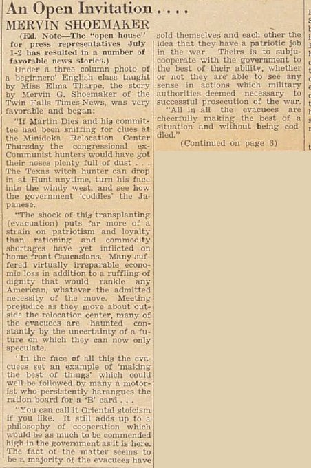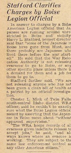 Page 1: Residents reject charter; welcome extended to men in Army who visit Seattle; staff housing plans delayed; Director Stafford relates ultimate objectives of the Minidoka center.