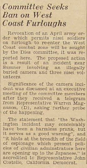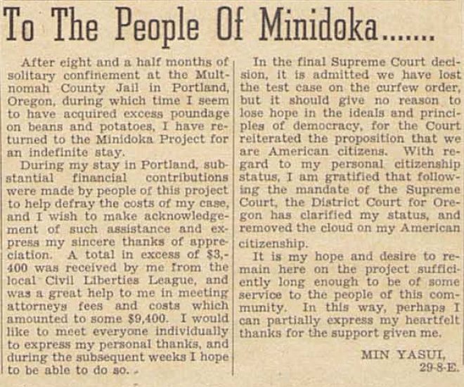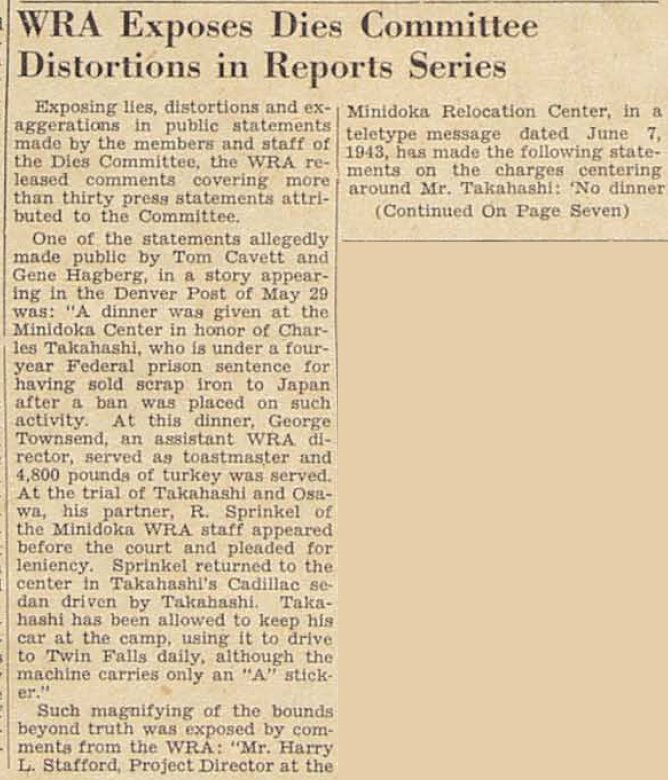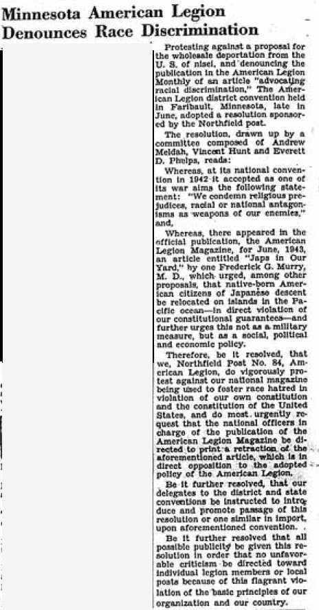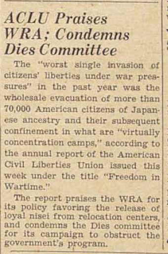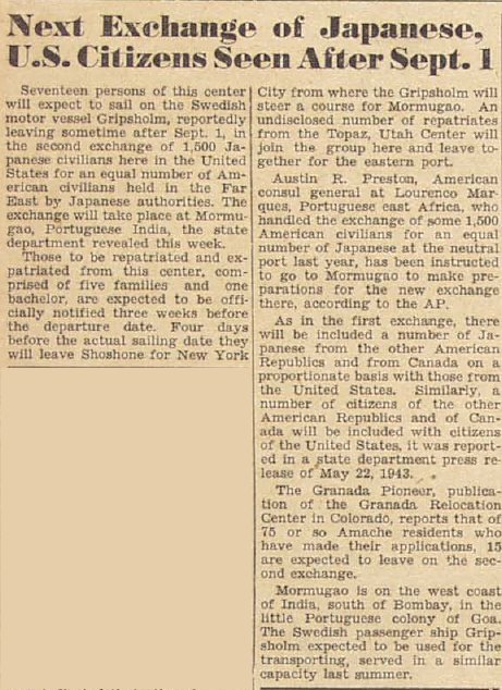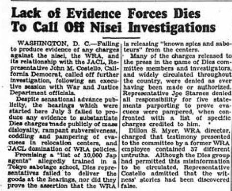 Page 1: Myer states WRA policies; Marcantonio bill calls for support of every Issei, Nisei; final election to be held Aug. 24; former Hunt official leaves 25 years in Idaho; Camp Shelby calls 3 more volunteers; pamphlets explain policies, operations of Tule center; Spanish counsel visits here.