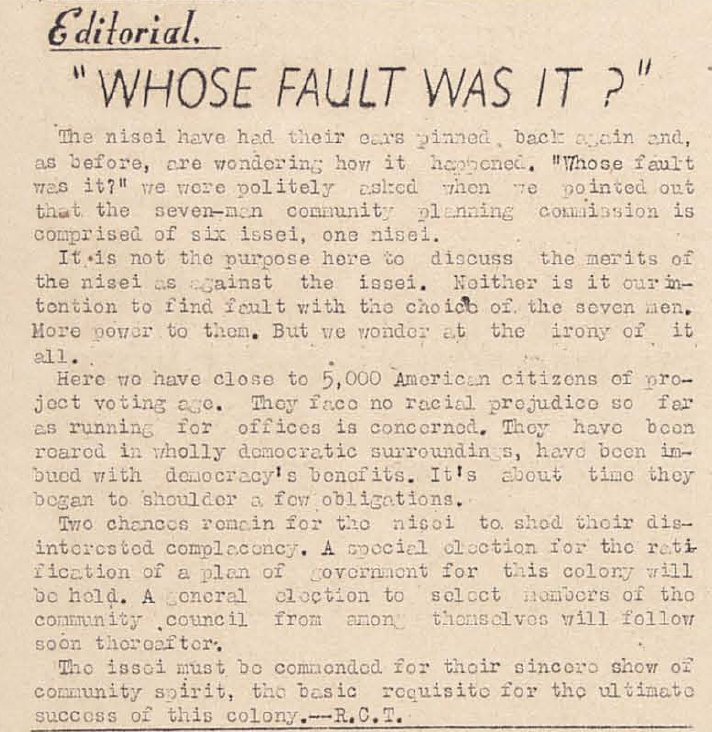 A very interesting article about the Issei and the Nisei (which terms are never capitalized in the paper for some reason), and the Nisei not taking enough of a role in camp politics.