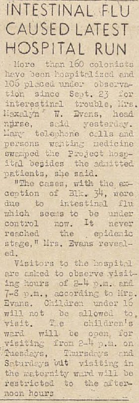 Page 3: Five more students got releases to attend colleges elsewhere. A labor board selection has begun. There might be a bus line within the community. One birth, two deaths, and last rites. Inventory of cots and blankets begins; article on some visitors; clothing allowance plan is ready; some kind of forms are ready to fill out although I can't exactly figure out what they are from the contents of the article.