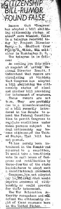 Rumors can work both ways. Apparently a rumor hit Minidoka that Congress was going to take away the citizenship status of the Nisei.