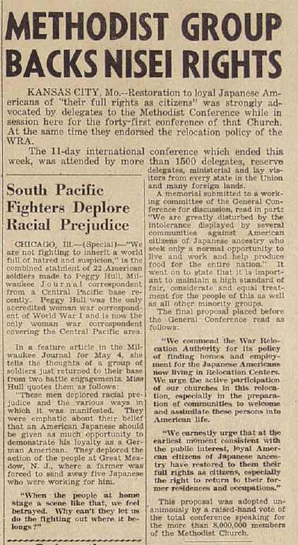 Page 2: Methodist group backs Nisei rights; Editorials; relocation opportunities; WRA survey indicates no Nisei industrial cutbacks; No. Park college has five Nisei; last year about this time.