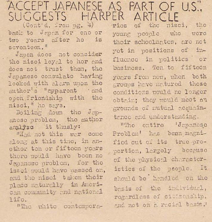Page 5: Placing evacuees in right job, WRA program; 85 fire hydrants have been knocked over by careless drivers; two depart for clothing meeting; War Savings Stamps are available; two articles relating to medicine; a Japanese entertainment program for Caucasians is set.