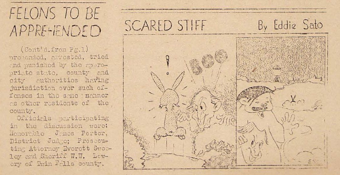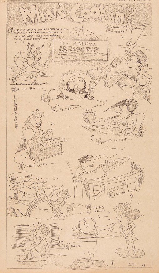 Page 6: A new cartoon, by Eddie Sato; there will be Japanese entertainment for the Caucasian staff; someone from the camp visited a relative at Lordsburg camp in New Mexico; WCAA repatriation forms were received by a bunch of people who never had asked for them.